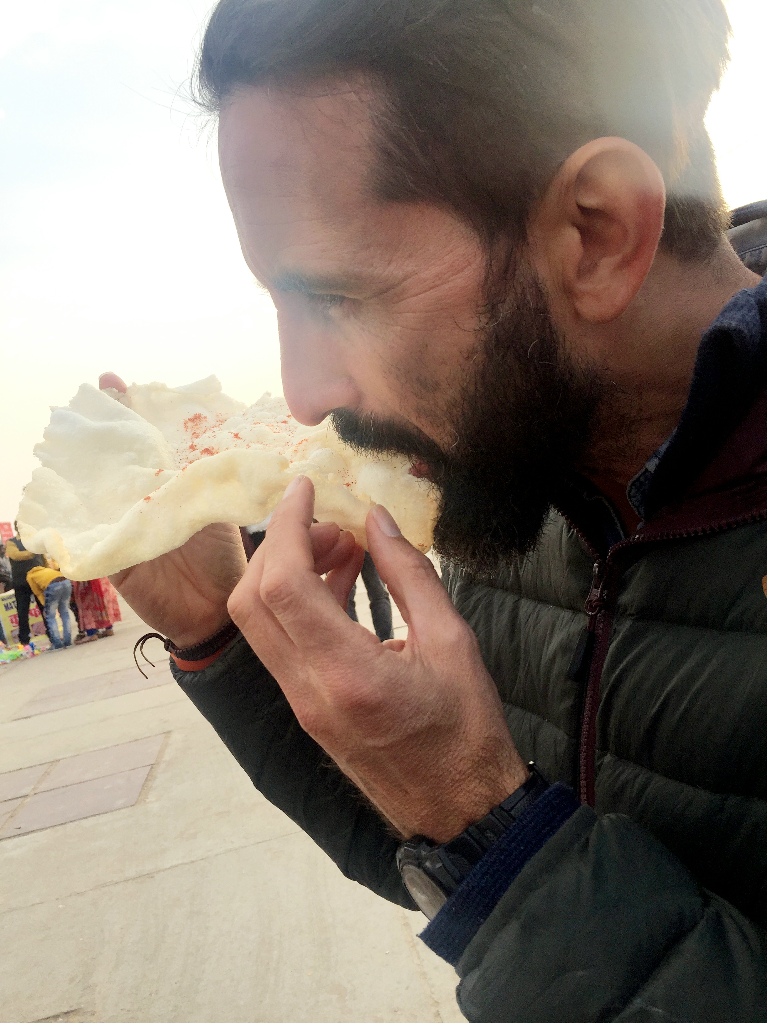 Trying krupuk with red pepper as afternoon snack
