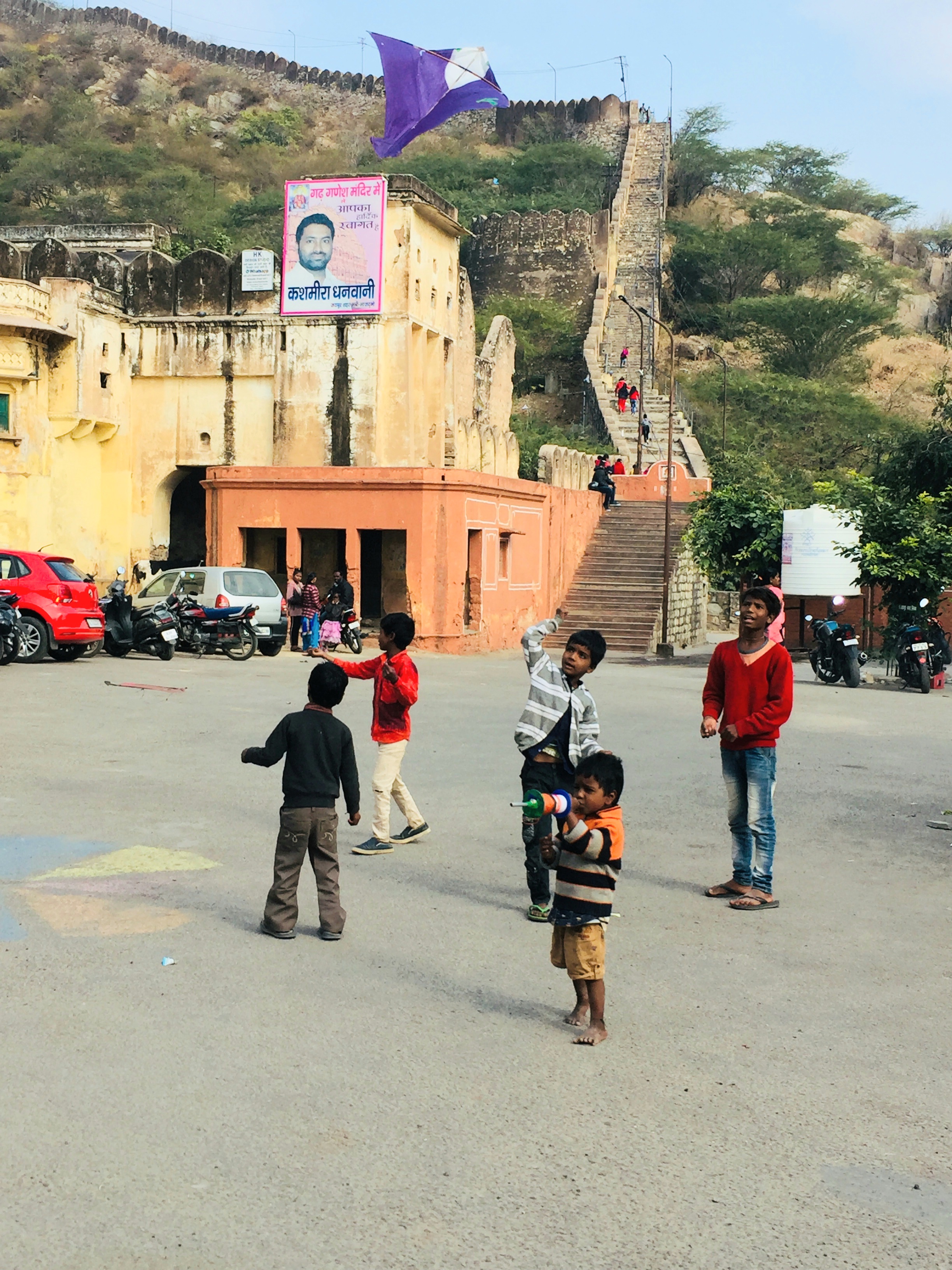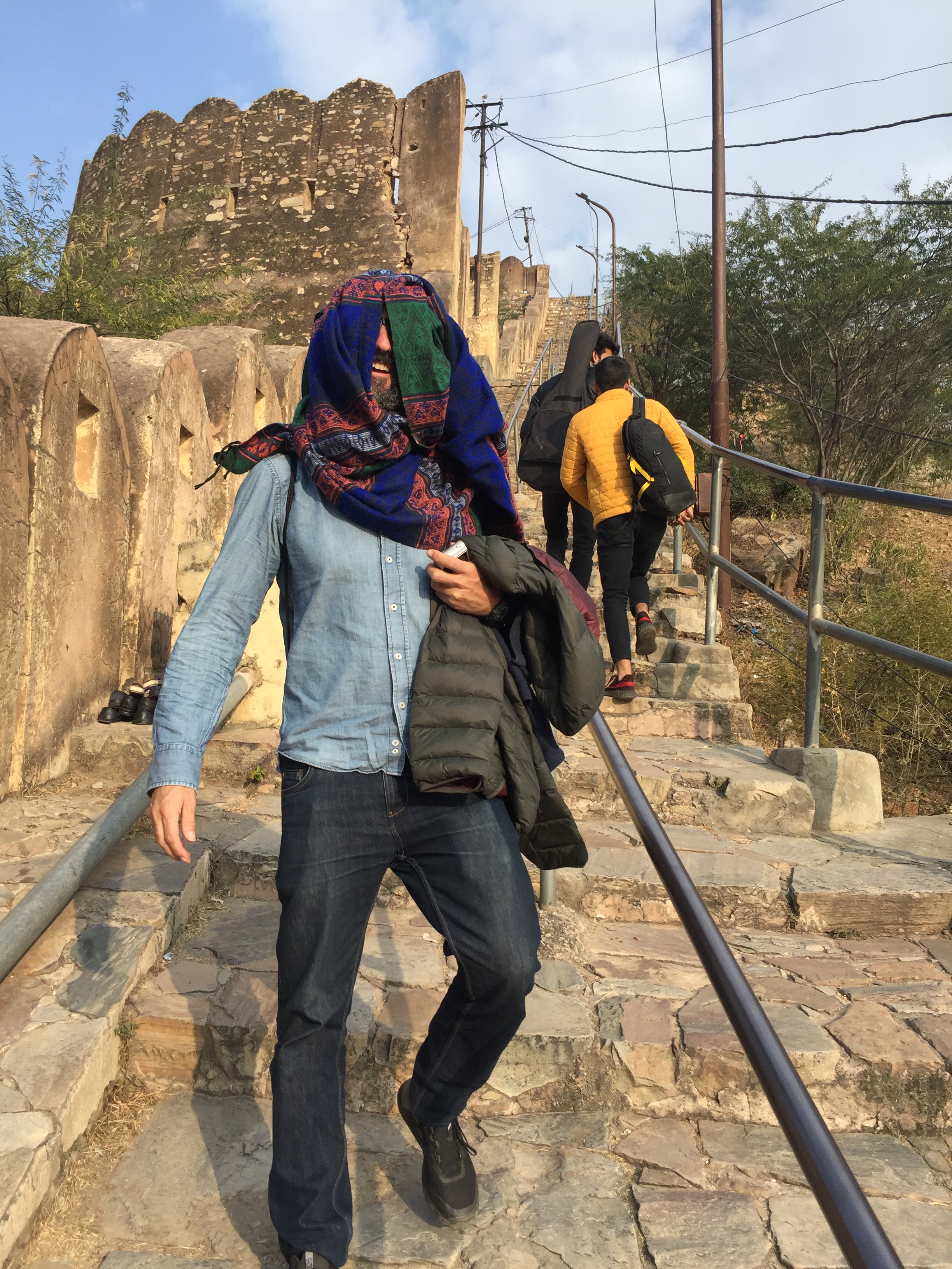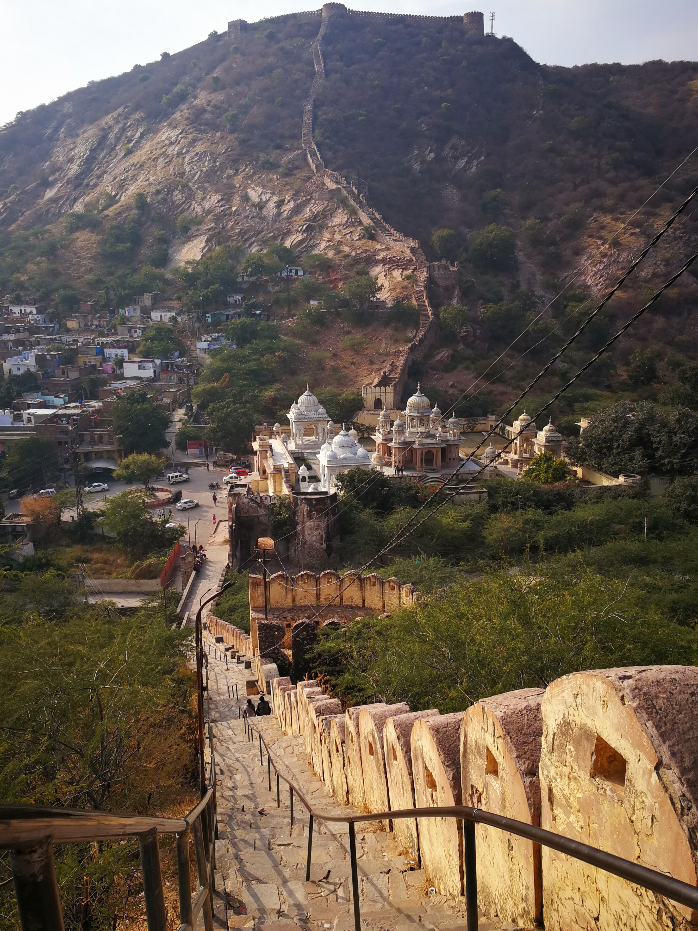 Our next stop is the temple of Lord Ganesh. To reach this 18th-century temple, you have to climb up this big, fortress wall, since the temple is located at the top of the Aravali hills.