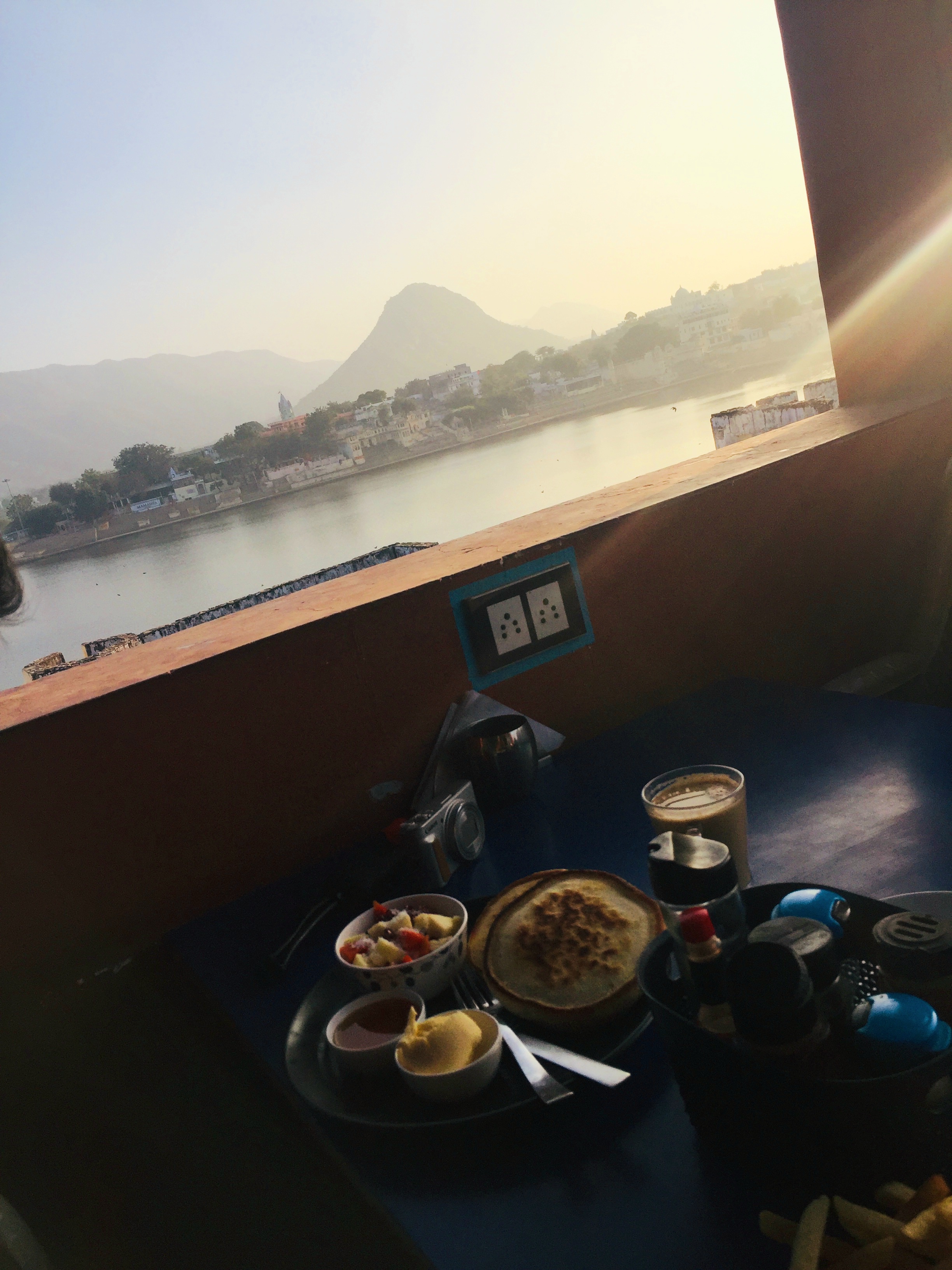 Probably the place with the best coffee, and the best view over Pushkar Lake! Right at the holy water/banks, overlooking the ghats (stairs) and holy baths.