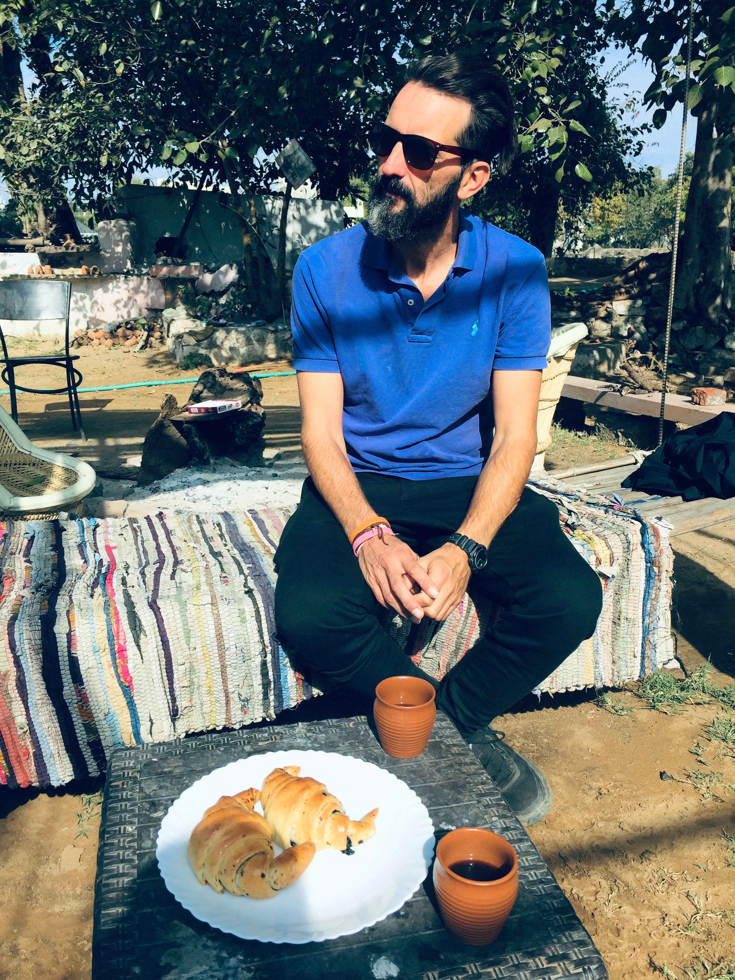 Enjoyin Italian coffee and French croissants at an Indian swing