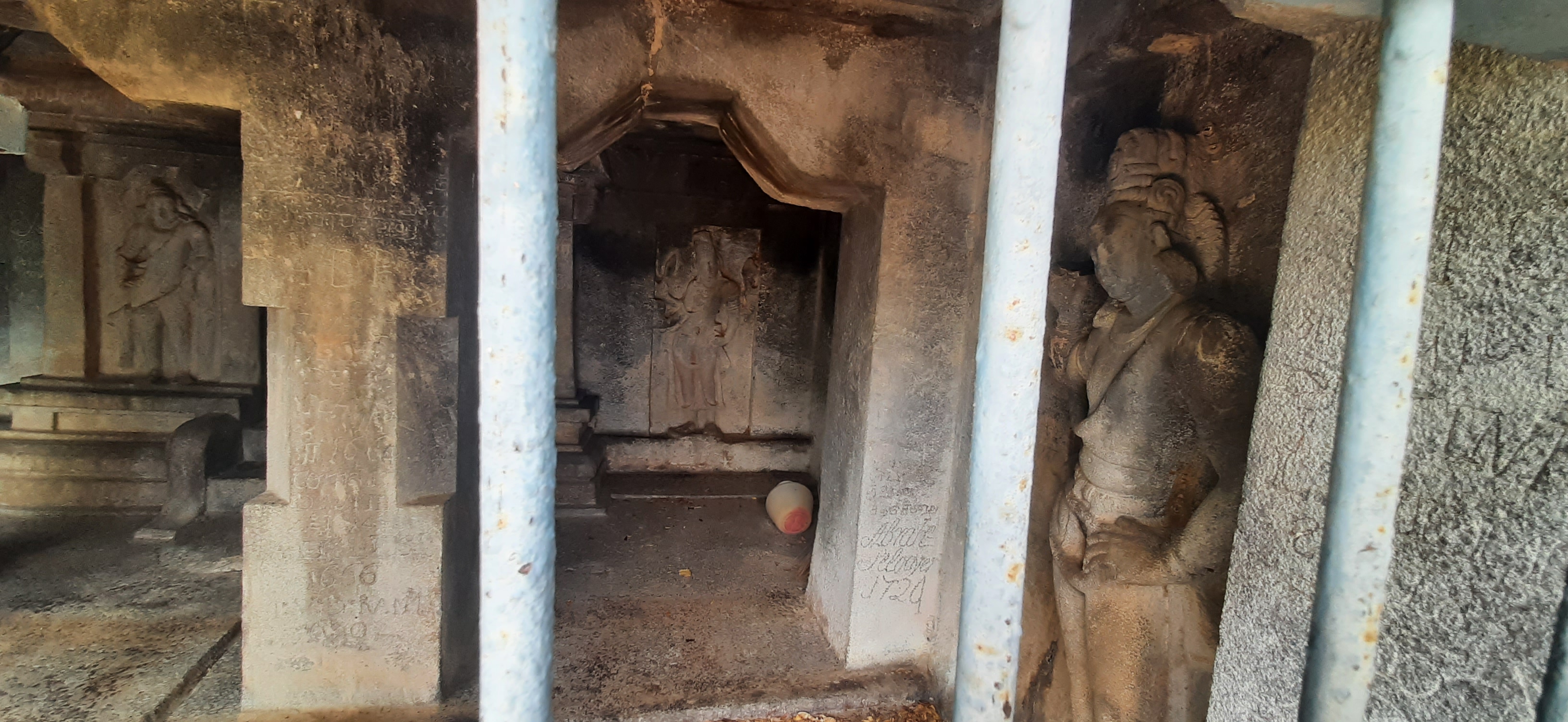 Some historical Dutch graffiti In and around the temple you can find Dutch remains. Inside the temple the priest pointed out a giant cast iron bell. As we understood from him this bell, like many other temple valuables, was taken from the temple and transported to the Dutch Fort at sea, during the time of the Dutch East India Company. Inside the cave temple on the way down you can find some interesting historical stone inscriptions. These texts imply that the Dutch actually visited the place, “driven by curiosity to visit the temple where eagles visit on a regular basis”. As a souvenir they have also etched their names in the temple wall, along with the date (29th of November, 1667). (Source: Thirukazhukundram.com)