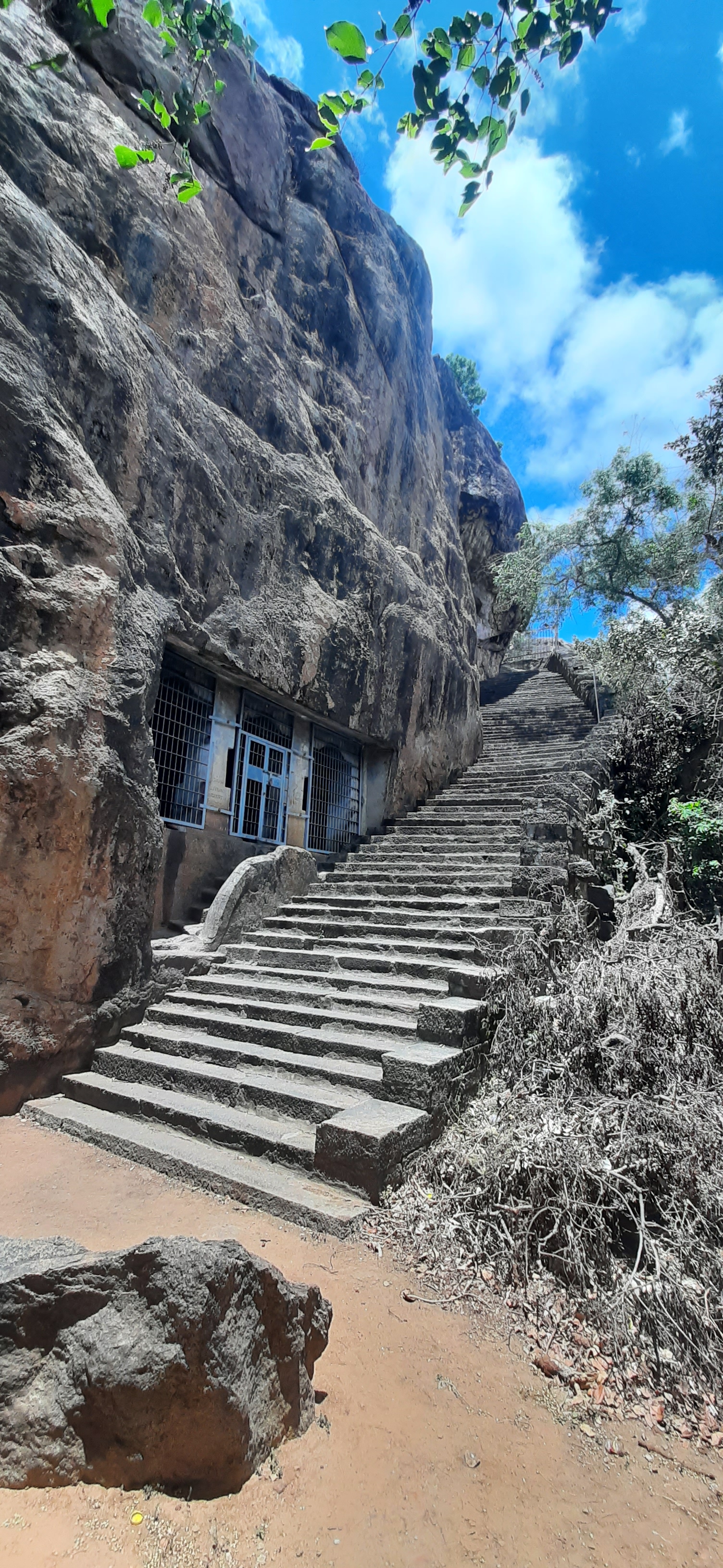 When you walk further up from the bird landing site you can visit a monolithic cave temple, full of “rare sculptures”. What makes these carvings so special, is that the religious scene is sculpted out of a single rock. Further down, along the stairs you find more carvings, protected with a fence and with some Dutch remains on the outside (see below).