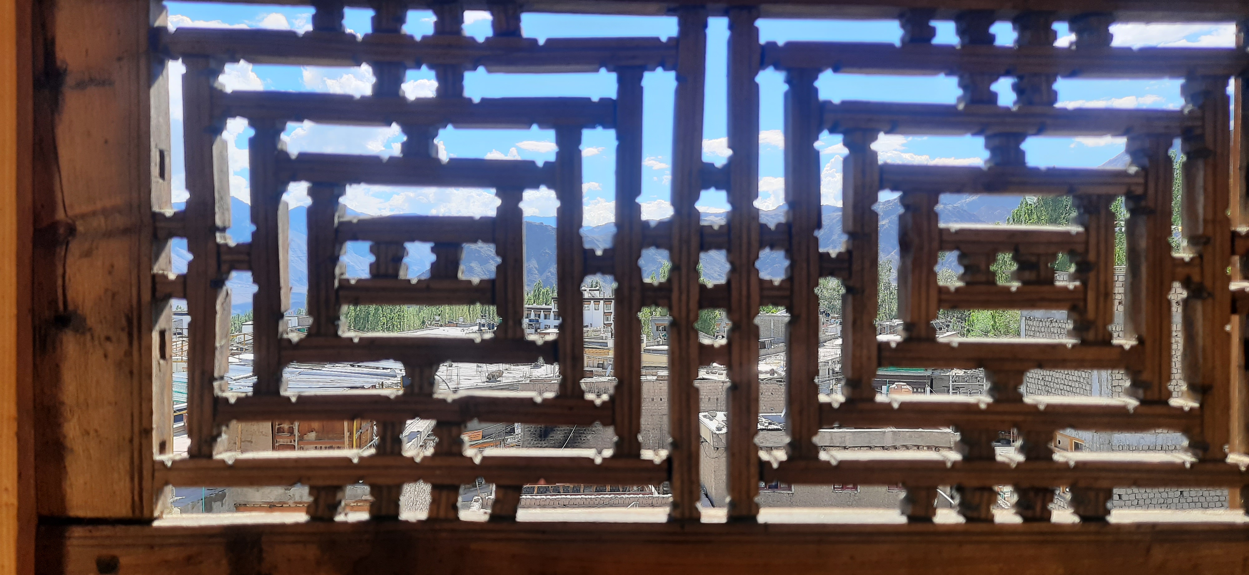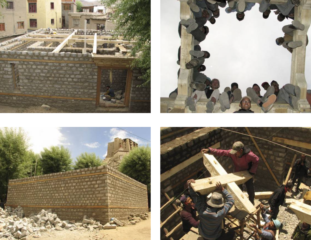 The capitals have been adapted from the Tsemo tower, and the center is a diamond ceiling, as found in many early Ladakhi temples. (source: Tibetan Heritage Fund)