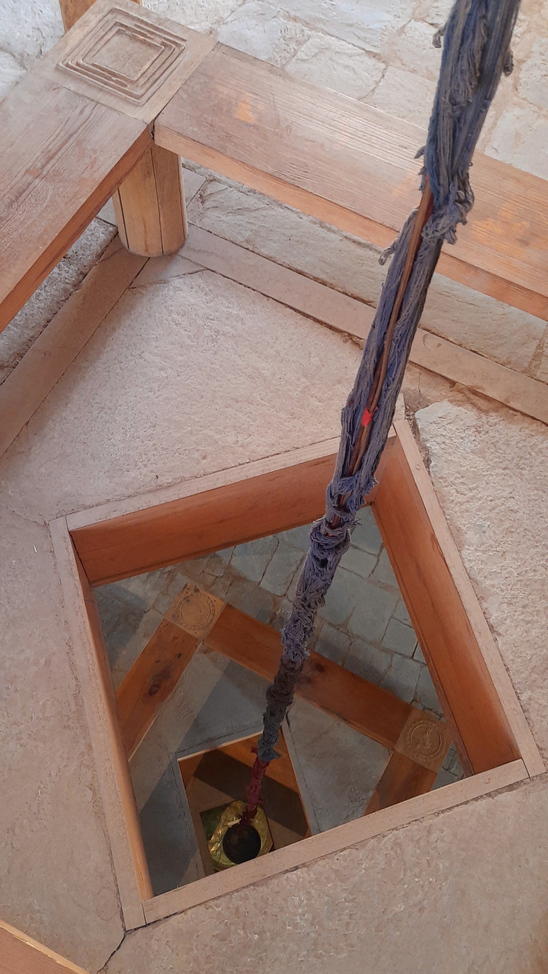 The four floors of the museum are connected by a spiral staircase with a special rope construcution in the middle of all of them. From the top floor you can look all the way down to the ground floor, where a metal pot is hanging.